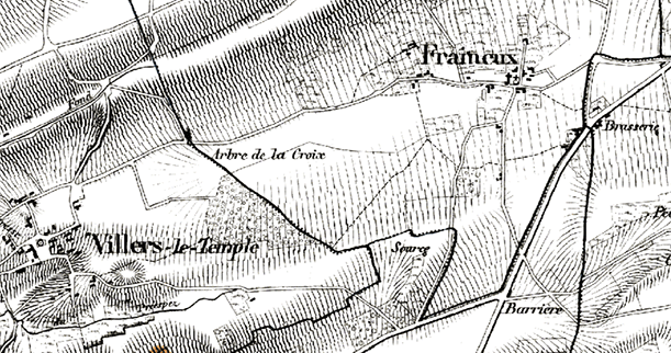 LocalisationÀ Fraineux, rue de la Chapelle. Inscription1788. CommentairesAu milieu de la campagne, à la limite Fraineux-Villers, sous un massif de tilleuls, au pied d'une charmante pierre monolithique en grès dans laquelle est logée une potale de la Vierge et surmontée d'une croix métallique, se dresse une stèle calcaire datée 1788. Cet endroit est intitulé "Arbre de la Croix" sur la carte de Vander Maelen datée de 1850. Photos